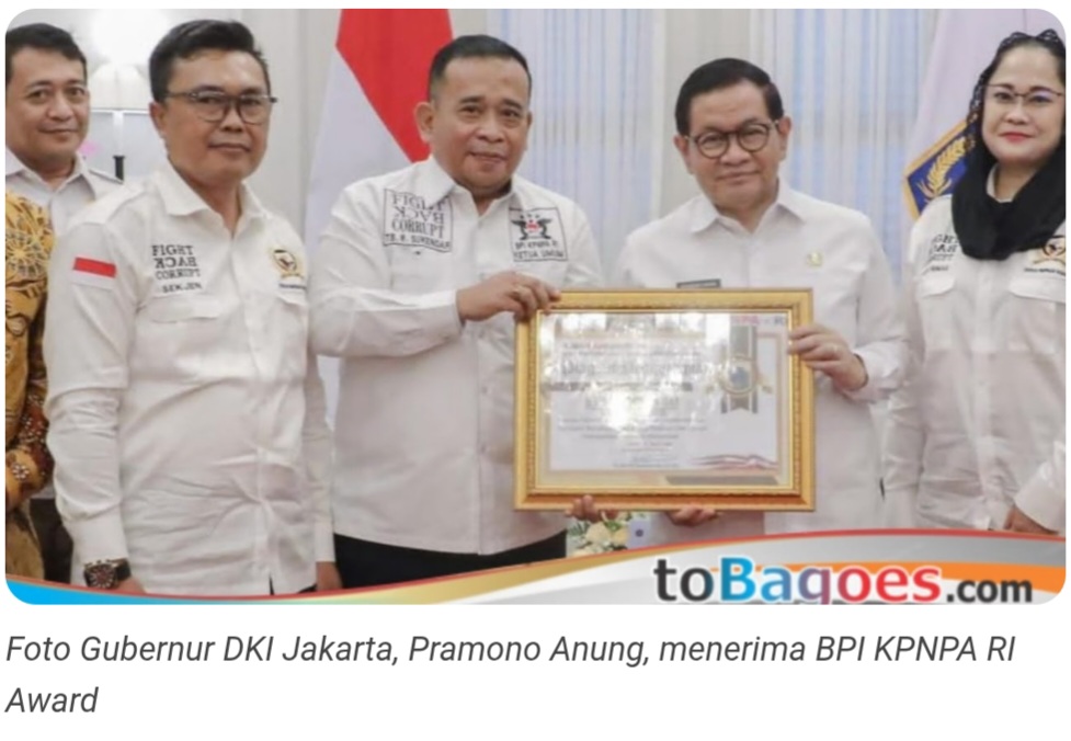 TOBAGOES.COM, Jakarta – Komitmen membangun sarana dan prasarana (sarpras) yang menyentuh langsung kebutuhan warga kembali mendapat pengakuan. Gubernur DKI Jakarta, Pramono Anung, menerima BPI KPNPA RI Award sebagai bentuk apresiasi atas dedikasi dan motivasinya dalam memajukan infrastruktur serta pelayanan publik di Ibu Kota.