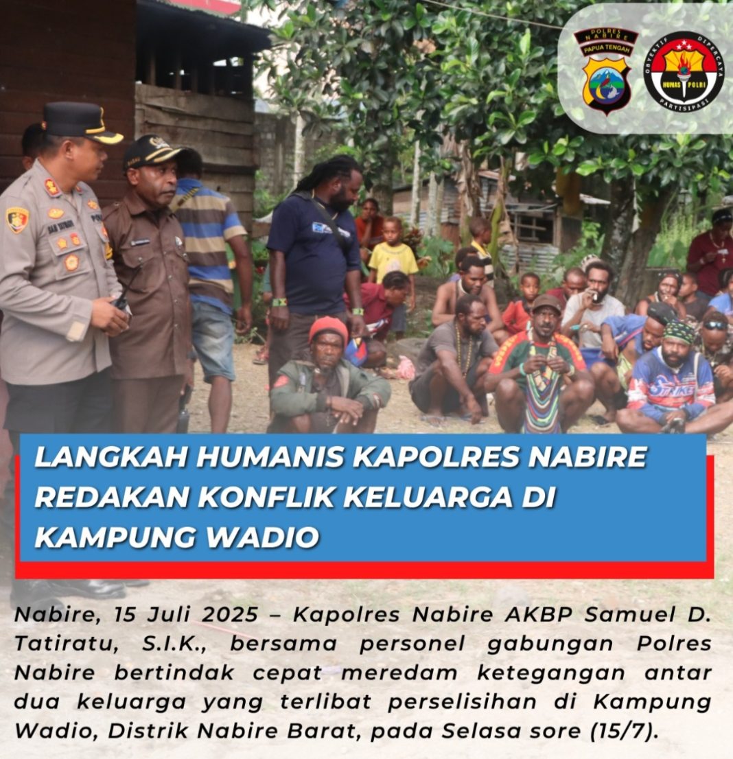 TOBAGOES.COM, Nabire/Papua Tengah – Kapolres Nabire AKBP Samuel D. Tatiratu, S.I.K, bersama personel gabungan Polres Nabire bertindak cepat meredam ketegangan antar dua keluarga yang terlibat perselisihan di kampung Wadio, Disttik Nabire Barat pada selasa sore (15/7/2025).