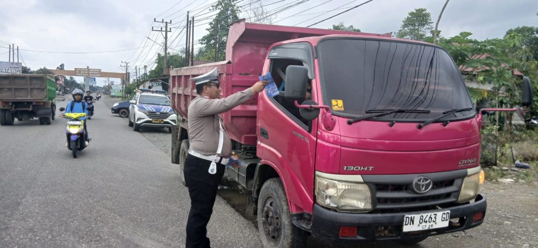 TOBAHOES.COM, Morowali/ Sulteng – Satuan Lalu Lintas (Satlantas) Polres Morowali melalui Unit Kamsel melaksanakan kegiatan sosialisasi dan pembagian brosur kepada pengemudi kendaraan R4 dan R6 bermuatan berlebih (overload), yang melintas di Jalan Trans Sulawesi, Kecamatan Bungku Tengah, Kabupaten Morowali, pada Kamis (10/07/2025) mulai pukul 15.30 WITA hingga selesai.