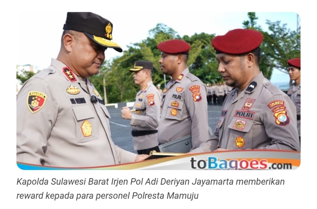 Mamuju – Kapolda Sulawesi Barat Irjen Pol Adi Deriyan Jayamarta memberikan reward kepada para personel Polresta Mamuju sebagai bentuk apresiasi atas keberhasilan mereka mengungkap sindikat curanmor besar, Jumat (6/3/26) di lapangan Tribrata Mapolda.